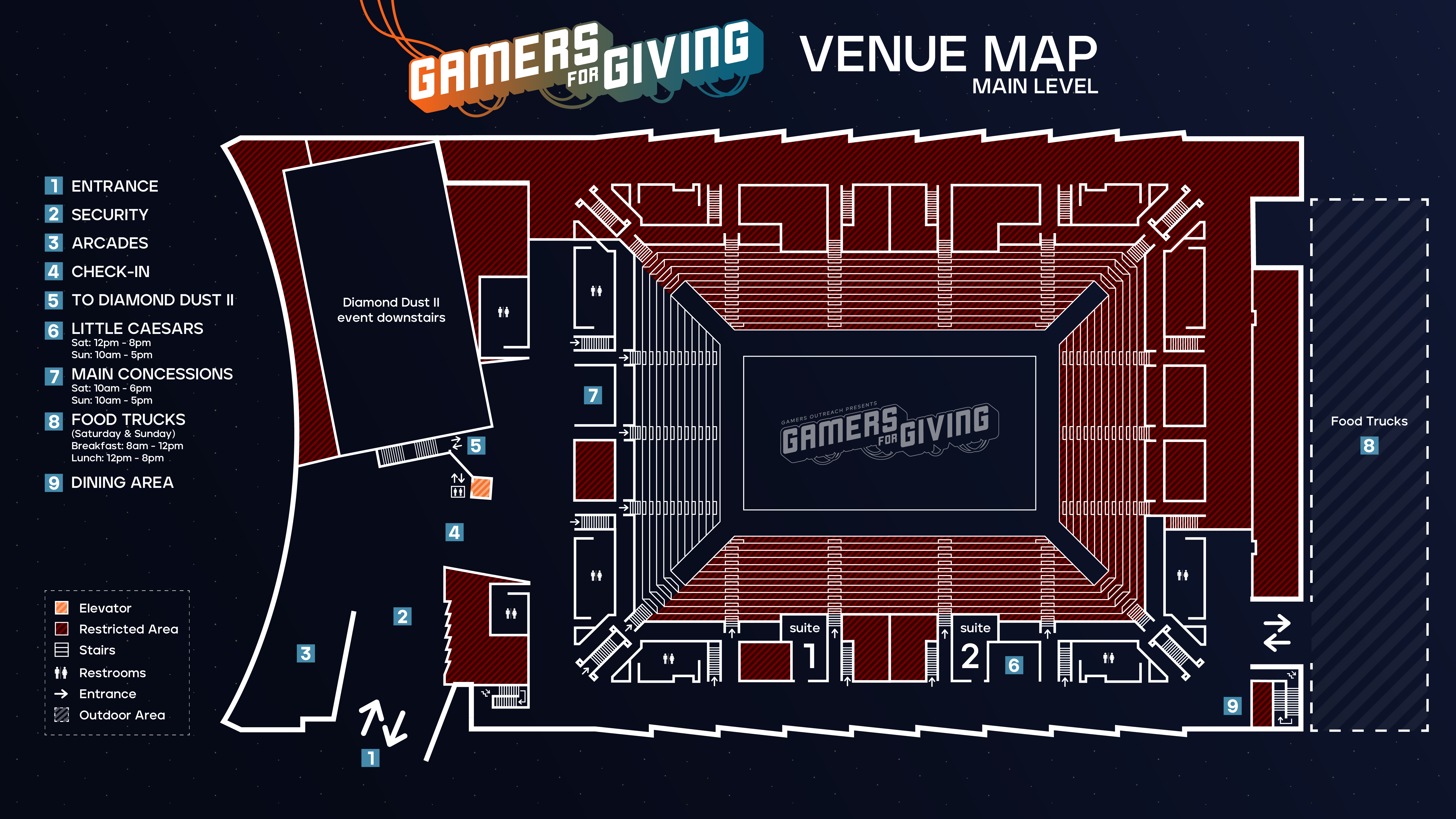 For those flying in from out of state, the closest airport to Gamers for Giving is the Detroit Metro Airport (airport code: DTW). The airport is about 20 minutes from the venue. Uber and Lyft are available for ground transportation.
